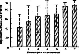 Рис. 9. Эмоциональный слух - способность воспринимать эмоциональные оттенки чужого голоса - неодинаков у разных людей. Высота масштабных столбиков на графике показывает вероятность правильного определения характера выражаемой голосом эмоции. Категории слушателей обозначены цифрами: 1 — школьники 1-го класса; 2 — школьники 2-го класса; 3 — взрослые; 4 — школьники 5-го класса; 5 — ученики начальных классов детской музыкальной школы; 6 — вокальный ансамбль «Тоника»; 7— студенты-вокалисты консерватории. Штриховыми линиями обозначены «лимиты» - пределы индивидуальных различий среди слушателей каждой категории (По Морозов, 1983).