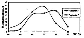 - Гистограмма распределения числа обследованных респондентов как функция уровня адекватности восприятия эмоционального контекста речи (ЭС) у «художников» существенно сдвинута в сторону более высоких уровней ЭС (см. рис. 10). Анализ гистограммы показывает, что общее число «художников» с высоким ЭС (свыше 80%) составляет 39,6% от численности всего коллектива, а этот же показатель у «мыслителей» равен всего лишь 12,8%, т. е. на 26,8% меньше, чем у представителей художественного типа Вместе с тем в коллективе «мыслителей» число лиц с низким ЭС (ниже 60%) составляет 17,9%, а у «художников» всего — 5,5%.