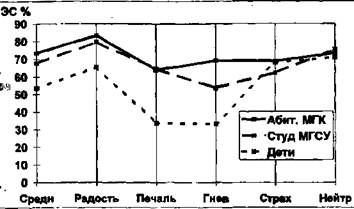 Рис. 11. Сравнительные уровни эмоционального слуха (%) при восприятии разных эмоций у студентов и школьников.