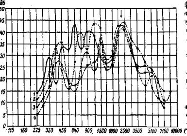 Рис. 12. Важнейшее эстетическое свойство голоса хороших профессиональных певцов - приятная на слух звонкость, «серебристый тембр» — зависит от присутствия в голосе усиленных по амплитуде высоких обертонов (в области Гц), получивших название высокая певческая форманта (ВПФ). На рисунке представлены наложенные друг на друга спектры голоса известных мастеров вокального искусства: 1 — Ф. Шаляпина (гласи. А, нота mi1 ), 2 - П. Лисициана (гласи. А, нота sol1), 3 — Э. Карузо (гласи. О, нота 1а1, 4 — Г. Зобиана (гласи. А, нота 1а1). Хорошо видно, что ВПФ, отмеченная стрелкой, у баса, баритона и двух теноров имеет большой уровень энергии и практически совпадает по своему расположению на шкале частот (По Морозову, 1977).