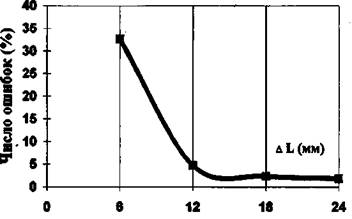 Рис. 14. Вероятность ошибок (%) определения относительной ширины рта говорящего как функция AL (мм)