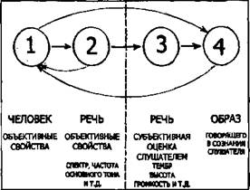 Рис. 16. Схема формирования психологического портрета человека по особенностям его речи и голоса включает четыре основных блока преобразования информации. Между объектом восприятия (блок 1) и его субъективным образом в сознании слушателя (блок 4) имеется два блока-посредника: объективные свойства речи говорящего (блок 2) и их субъективная оценка слушателем (блок 3). Стрелкой сверху (1-4) указан возможный канал априорной информации слушателя о говорящем (например, ранее полученные о нем сведения или получаемые непосредственно в процессе общения путем зрительного восприятия собеседника и т. п.), воздействующий на формирование слушателем образа говорящего по механизму психологической установки.