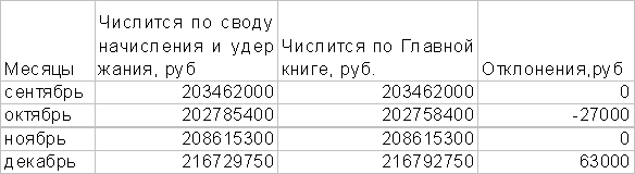 Убедившись, что данные Главной книги и баланса совпадают, можно продолжить дальнейшую сверку. Для этого сравним данные Главной книги со сводом начислений и удержаний. (табл.3).