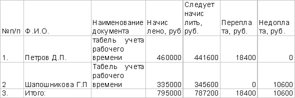 Следующим этапом является проверка табелей учета рабочего времени. Здесь установим, что случаев включения в них вымышленных (подставных) лиц нет, так как в нарядах и табелях учета рабочего времени фамилии совпадают с данными учета личного состава. Случаев повторного начисления сумм по ранее оплаченным первичным документам, повторения одних и тех лиц в нескольких расчетно-платежных ведомостях не обнаружено.