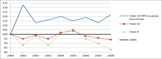 1. Современное понимание экономических процессов предполагает всестороннее исследование их неэкономических последствий для территории. В частности, это касается экологических и социальных параметров устойчивого развития. Для сравнительного статистического исследования уровня устойчивого развития представляется усовершенствованный и адаптированный для регионального уровня показатель – среднедушевой экологически скорректированный чистый региональный продукт (ЭСЧРП). ЭСЧРП основывается на принципах построения, унифицированных с национальной и международной практикой, включает в себя элементы, разработка которых ведется органами официального статистического учета во всех исследуемых регионах, что подтверждает идею о его сопоставимости как во времени, так и в пространстве.