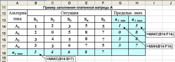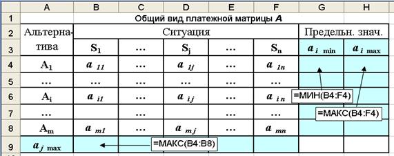 Необходимые расчеты по выбору оптимального решения удобно вести в среде Excel. Общий вид платежной матрицы с дополнительной строкой и двумя столбцами, в которые заносятся наибольшие a j max, a i max и наименьшее a i min значения выигрышей, представлен на рис. 3.1.