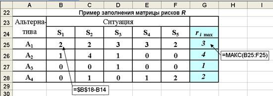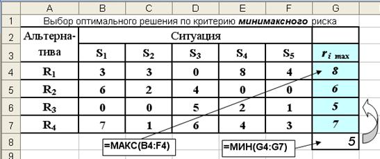 2. В каждой строке матрицы рисков с помощью функции МАКС выбирается ее максимальный элемент (ячейки G4:G7): ri =