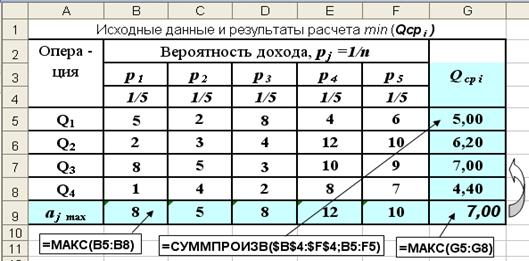 1. Исходные данные вводятся в Excel (рис.3.10). Затем, используя функцию МИН для ячеек (B4:F4;…; B7:F7), последовательно находятся минимальные значения по каждому i-му решению