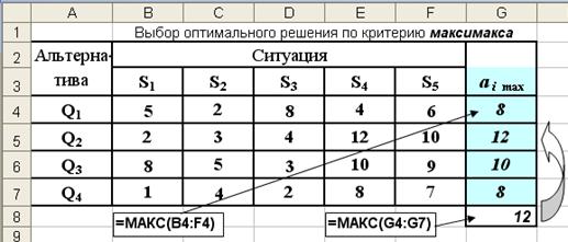 2. Из последовательности найденных максимальных значений ai (G4:G7) с помощью функции МАКС (ячейка G8) выбирается наибольшее значение: a2=12, с учетом этого рекомендуется принять второе решение.
