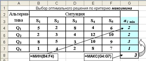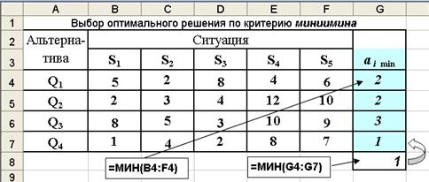 3. Из последовательности найденных минимальных значений ai (G4:G7) с помощью функции МИН (ячейка G8) выбирается наименьшее значение: a4=1, с учетом этого рекомендуется принять четвертое решение.
