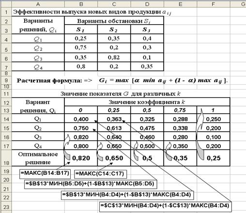 Рис. 3.13. Исходные данные, расчетные формулы и результаты расчета критерия Гурвица (стрелки показывают эффективные решения)