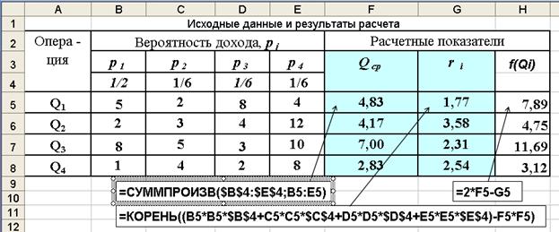 Расчеты средних ожидаемых доходов и рисков по вышеприведенным формулам выполним в среде Excel. Рабочий лист с исходными данными, расчетными формулами и результатами расчета средних доходностей Q c p и риска r приведен на рис. 3.14.