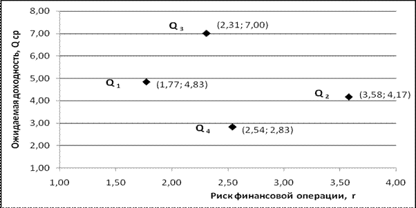 Рис. 3.15. Графическая интерпретация результатов расчета эффективности финансовых операций в системе координат: ожидаемая доходность – риск