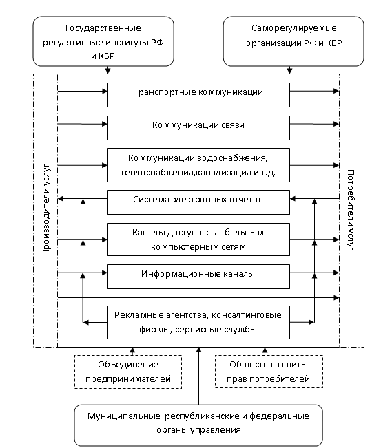 На рис. 1 показана схема инфраструктуры рынка услуг КБР, в механизме функционирования которой имеются и управленческие, и регулятивные функции, реализуемые различными институтами инфраструктуры.