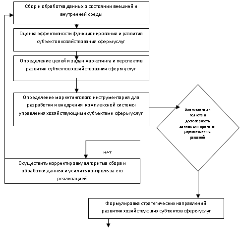 Результативность внедрения маркетинга в деятельность хозяйствующих субъектов сферы услуг определяется в первую очередь наличием достоверных и оперативных данных о процессах, происходящих во внешней и внутренней среде деятельности структур хозяйствования сферы услуг, которые используются при построении комплексной системы управления на основе маркетингового подхода и при разработке рекомендаций по повышению эффективности хозяйствующего субъекта и управления им с целью выявления сильных и слабых сторон, определения направлений функционирования, влияющих на устойчивое развитие хозяйствующих единиц сферы услуг в целом в условиях рынка.