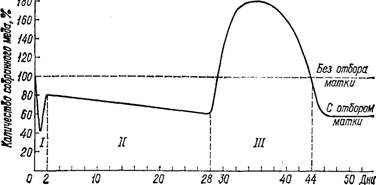 На рис. 1 приведен упрощенный график, отражающий изменение медосборной активности у семьи с отобранной маткой (при среднем медосборе) по сравнению с семьей, у которой матку оставили: I период—от отбора матки до закладки свищевых маточников, II—от закладки маточников до начала яйцекладки молодой матки и III—от начала яйцекладки молодой матки до ослабления семьи из-за уменьшения количества летных пчел, вызванного отсутствием плодной матки в I и II пе-