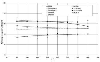 где а – температурная зависимость коэффициента температуропроводности, Ср – температурная зависимость теплоемкости, ρ – температурная зависимость плотности материала, рассчитанная с помощью температурной зависимости коэффициента линейного термического расширения. Относительная погрешность измерений 8%.