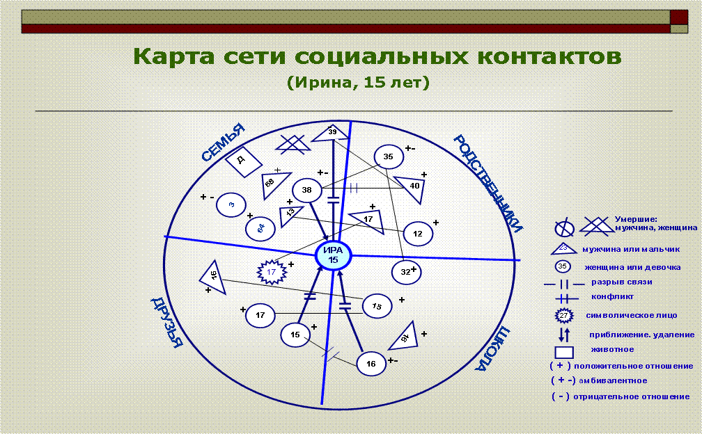 Знаком (-) обозначаются значимые люди, к которым человек относится негативно. Знаком (+) он обозначает тех, к кому он испытывает положительные эмоции. Знаком (+ -) или вообще никак можно не обозначать тех значимых лиц, к которым у клиента амбивалентное (нейтральное) отношение, т. е. нет особой ни симпатии, ни антипатии, но они для него всё равно значимы.