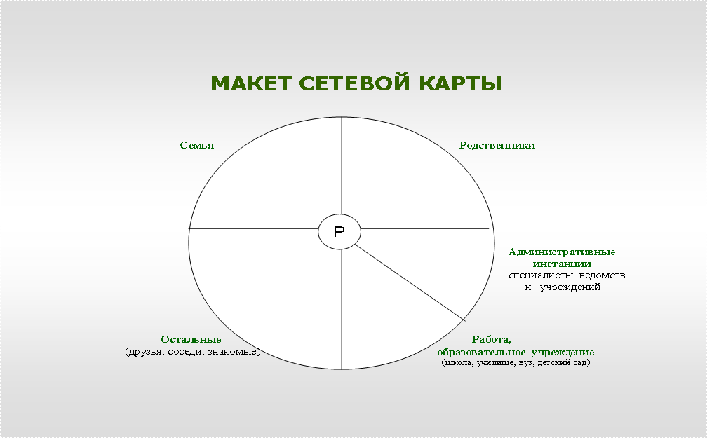 Их необходимо разместить на определённом расстоянии по отношению к ребёнку. Он сам изображён в середине круга. Тех, кто для него наиболее значим, он располагает на более близком расстоянии к себе, других – дальше. На сетевой карте изображаются и те люди, с которыми он находится в конфликте.