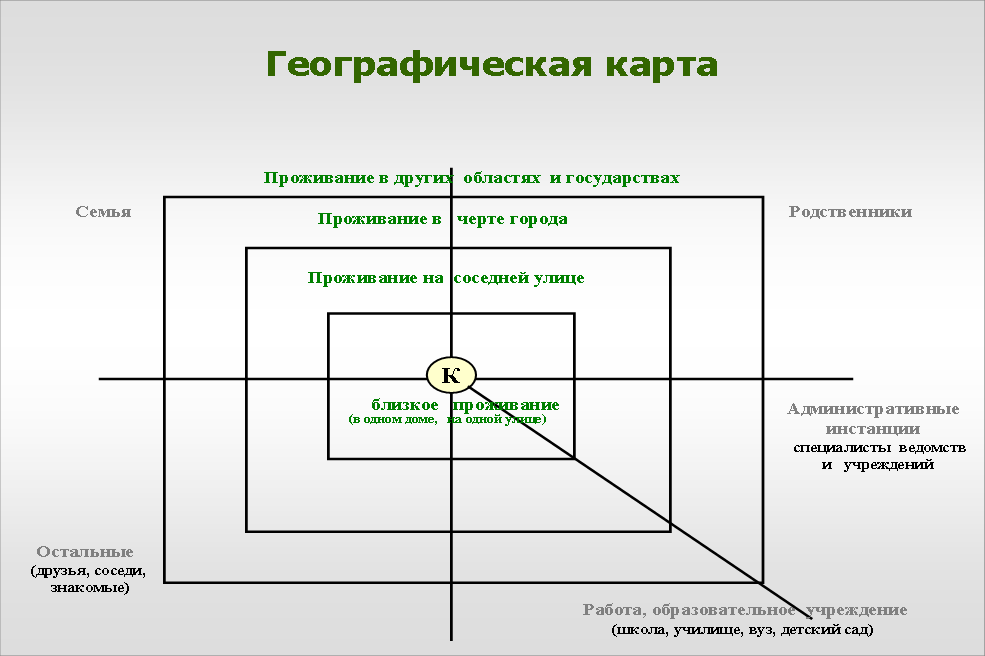 Позволяет отследить отдалённость проживания лиц, которые являются значимыми в жизни ребёнка. Территориальность проживания изображается не при помощи кругов, а квадратами: 1 квадрат, самый близкий к центру, где изображён клиент, - это проживание значимых людей рядом или на соседних улицах; 2 квадрат – черта города; 3 квадрат – область; 4 квадрат – другие города и государства).