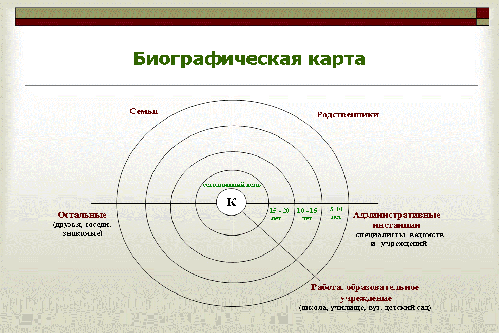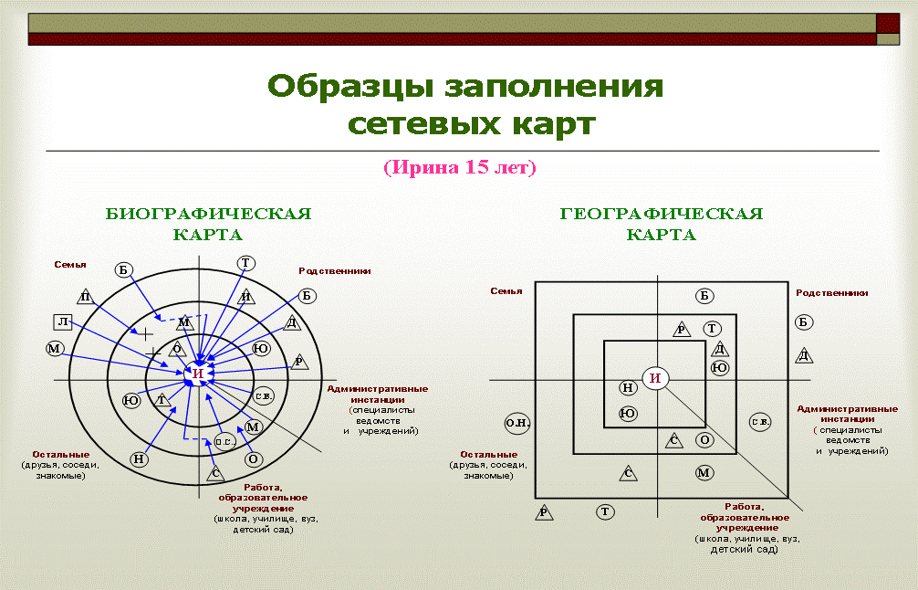 Биографическую карту можно сравнить с годовыми кольцами дерева. Внутреннее кольцо – это самая старая часть дерева и самые старые социальные контакты человека. Внешние кольца – это связи, возникшие на каком – то этапе жизни ребёнка. Благодаря биографической карте можно выявить людей, значимых для человека в определённые годы его жизни и возобновить с ними связи, если это возможно, для решения проблем клиента (см. рисунок 6 – образцы составления географической и биографической типов сетевых карт).