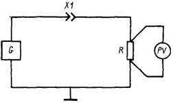 G — источник напряжения; PV — вольтметр; R — резистор; X1 — измеряемый контакт