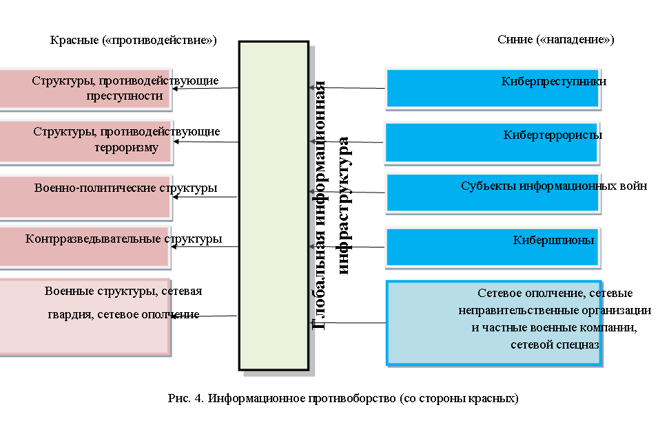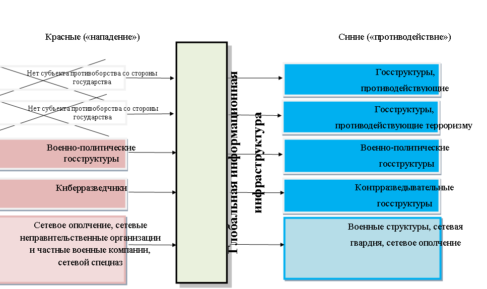 А будущие кибервойска – это роты и батальоны молодых людей, «до зубов вооруженных» компьютерной и телекоммуникационной техникой, поле деятельности которых – глобальное информационное пространство, где почти нет ограничений на взаимодействие и технические обеспечение.[8] Порталы входа в киберпространство для них могут быть в любой точке земного шара и околоземного пространства.