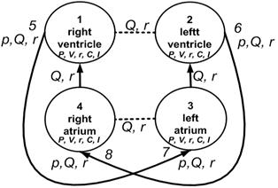 Для моделирования функционирования сердца предлагается считать, что каждой его камере соответствует сферический резервуар с эластичными стенками, которые обладают инерционностью. Резервуары соединяются между собой жесткими, нерастяжимыми, короткими проточными каналами, которые характеризуются гидродинамическим сопротивлением. Некоторые из этих каналов в определенные промежутки времени могут быть закрыты. Отдельные камеры могут иметь дополнительные соединительные каналы (межпредсердные и межжелудочковые дефекты) (рис. 1).