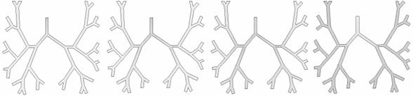 На рис. 2 и 3 представлены результаты численных экспериментов, описывающих распространение волн давления по артериальным частям легочного и системного отделов кровеносной системы, соответственно. На обоих рисунках градиент серого показывает отклонение текущего значения давления в сечении сосуда от его минимального значения за сердечный цикл. В целях наглядности масштаб для каждого из сосудов был выбран отдельно, то есть наиболее темный цвет соответствует максимальному за сердечный цикл давлению в конкретном сосуде. Слева направо на рис. 2 и 3 показаны мгновенные распределения давления в течение одного сердечного цикла через равные промежутки времени.