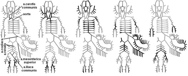 Следует отметить, что относительные размеры (длины и диаметры) для разных сосудов изображенных на одном и том же рисунке не соответствуют действительности. Они выбраны таким образом лишь для удобства визуализации, поскольку структура кровеносных сосудов представляет собой достаточно сложный граф, который, вообще говоря, не поддается планаризации. При визуализации графа кровеносной системы, как и при проведении вычислений, следует учитывать, что характерные размеры наиболее крупных и наиболее мелких сосудов могут отличаться более чем в 100 раз. Отметим также, что схема артерий легочного круга (рис. 2) вполне соответствует реальности, в то время как схема артерий большого круга (рис. 3) является не полной. На данный момент в нее входят грудной и брюшной отделы аорты и их основные ветви, сосуды верхних и нижних конечностей, подробно детализированы также сосуды головы и мозга, желудка и кишечника.
