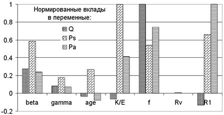 Этот метод основан на предварительном получении коэффициентов чувствительности модели к параметрам. Эти коэффициенты сами по себе представляют интерес. Приведенные на рис. 10 результаты анализа чувствительности согласуются с физиологическими представлениями. В частности, возраст (повышение жесткости артерий и желудочка) существенно увеличивает верхнее артериальное давление и уменьшает значения остальных переменных; наибольший вклад в нижнее артериальное давление вносит R1, в верхнее артериальное давление — параметр K/E, а в системный кровоток — частота пульса f.