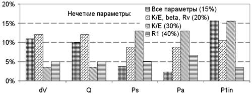 Относительные погрешности переменных модели в большинстве случаев меньше погрешностей каждого из нечетких параметров (см. рис. 11), что говорит о применимости модели на практике. Важно, что это касается основных переменных модели — Q, PS, Pa: при погрешности всех параметров в 15% эти показатели имеют неопределенность всего 5–10%. И напротив, наименее точно рассчитываются наименее значимые результаты: так, относительная погрешность систолического и диастолического объемов достигает 40%.