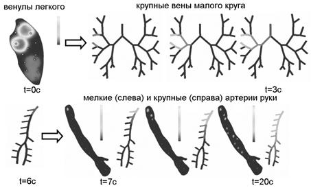 Рис. 12. Начальные стадии распространения вещества, попавшего в организм после вдоха.