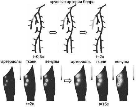 Пример расчетов, по переносу вещества, попавшего в легочные вены после вдоха, представлен на рис. 12. На нем представлены начальные стадии распространения вещества по организму. Оттенками серого показана величина концентрации, причем максимальному значению соответствует наиболее светлый оттенок. В начале (0 c) вещество содержится лишь в венулах легочного круга, затем оно распространяется по крупным венам и достигает правого предсердия. Поскольку в сердце содержится довольно значительное количество крови по сравнению поступающей в него за один сердечный цикл, то заметное повышение концентрации в артериях большого круга происходит с задержкой. В частности, в данном эксперименте отслеживалось попадание вещества в ткани правой руки.