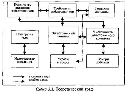 При построении ТМПИ нас интересуют прежде всего логические связи, которые можно выразить при помощи теоретического графа, в данном случае описывающего феномен забастовки. Построив мысленные связи между абстрактными объектами, социолог на следующем этапе