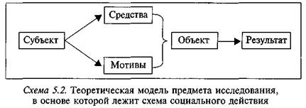 Пример теоретической модели 2. В основе второго способа построения ТМПИ лежит схема социального действия (схема5.2). Если мы определяем социологию как науку о поведении больших социальных групп людей, то вполне уместно строить ТМПИ именно таким образом, т. е. выделив пять ключевых элементов социального действия: