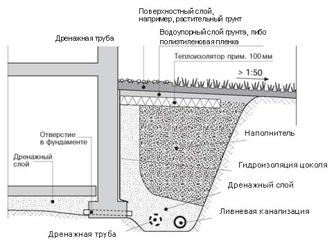 Вдоль стены фундамента водопропускающий слой щебня должен подниматься до самой поверхности земли. Если в здании есть помещения ниже уровня земли, следует предусмотреть гидроизоляцию на внешней стенке фундамента. Регулируя структуру поверхностного слоя почвы, находящейся в непосредственной близости к фундаменту, можно снизить поглощающие характеристики данного участка почвы. Поверхностный слой почвы и расположенный под ней утрамбованный слой земли или полиэтиленовую пленку укладывают с уклоном минимум 150 в направлении от дома.