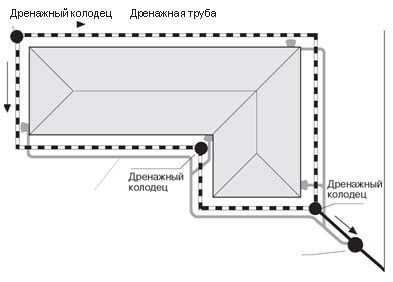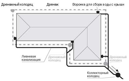 С крыши загородного дома за год стекает в среднем 50-100м3 талой и дождевой воды. Если эту воду оставить на участке, она может образовывать во дворе лужи и скользкие наледи. Вследствие чего со временем могут обнаружиться повреждения здания из-за повышенной влажности вокруг фундамента. Внимание! Дождевую воду нельзя отводить в дренажную систему. В противном случае, вода, наполняющая дренажную систему во время сильного дождя, поднималась бы в фундамент дома! То же самое происходило бы при образовании в трубе, сбрасывающей воду в грунт, затора или при ее замерзании. Форма дренажной трубы или расположение отверстий ситуацию в данном случае не исправят.