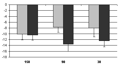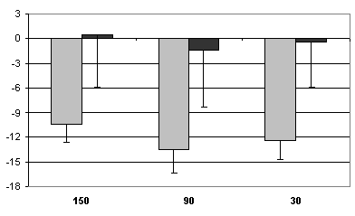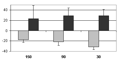 Рис. 6. Изменение момента силы мышц голени после 7-суточной АНОГ -6º при положении угла в коленном суставе 90º. Светлые столбцы - изменения в КМ преимущественно, темные – ПБМ. По оси абсцисс угловая скорость движения (град/сек) по оси ординат – величина изменения момента силы в %. Значения усилия до иммерсии приняты за 0. Вертикальные линии – стандартные ошибки среднего, звездочки – достоверность изменений при р<0,05.