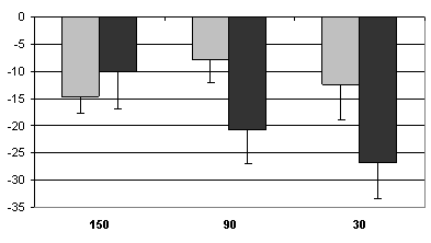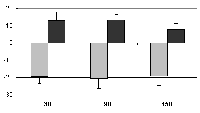 Рис. 4. Изменение момента силы ТМГ после 7-суточной иммерсии. Обозначения: светлые столбцы - изменения в ТМГ в целом, темные – в КМ преимущественно. По оси абсцисс угловая скорость движения (град/сек) по оси ординат – величина изменения момента силы в %. Значения усилия до иммерсии приняты за 0. Вертикальные линии – стандартные ошибки среднего, звездочки – достоверность изменений при р<0,05.