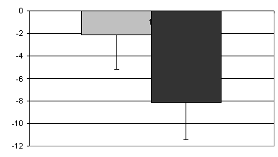 Рис. 3. Изменение выносливости ТМГ после 3-суточной иммерсии Обозначения: светлые столбцы - изменения вТМГ в целом, темные – в КМ преимущественно. По оси ординат – величина изменения выносливости в %. Значения выносливости до иммерсии приняты за 0. Вертикальные линии – стандартные ошибки среднего, звездочки – достоверность изменений при р<0,05.