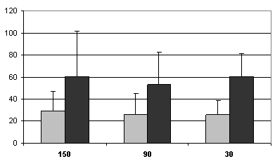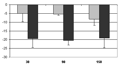 Рис. 10. Изменение электромеханической стоимости усилия трехглавой мышцы голени после 7-суточной иммерсии. Светлые столбцы - изменения в группе «иммерсия», темные – в группе «иммерсия+КОР». По оси абсцисс угловая скорость движения (град/сек) по оси ординат – величина изменения электромеханической стоимости усилия в %. Значения электромеханической стоимости усилия до иммерсии приняты за 0. Вертикальные линии – стандартные ошибки среднего, звездочки – достоверность изменений при р<0,05.