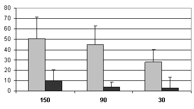 Рис. 2. Изменение скорости нарастания усилия ТМГ голени после 3-суточной иммерсии. Обозначения: светлые столбцы - изменения в ТМГ в целом, темные – в КМ преимущественно. По оси абсцисс - угловая скорость движения (град/сек), по оси ординат – величина изменения скорости нарастания усилия в %. Значения скорости нарастания усилия до иммерсии приняты за 0. Вертикальные линии – стандартные ошибки среднего, звездочки – достоверность изменений при р<0,05.