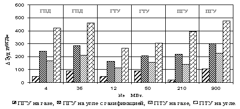 4. При условиях одинаковой электрической мощности нового и заменяемого оборудования или сохранении постоянным расхода топлива на ТЭЦ теплофикационная мощность установки снижается до 0,15-0,6 по сравнению с паротурбинным вариантом, увеличивая нагрузку пиковых котлов. При этом уменьшается экономия топлива от теплофикации до 0,2-0,7 по сравнению с паротурбинным вариантом в связи с увеличением удельной выработки энергии на тепловом потреблении у новых установок. Удельные выбросы вредных веществ, при замене ПТУ на ГТУ и ПГУ снижаются по оксидам азота на 3-8% и оксидам углерода 30-60%.