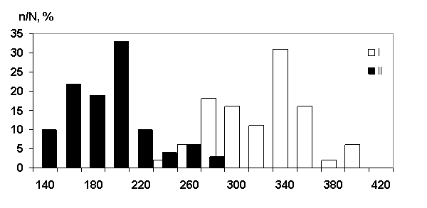 Рисунок 1 – Гистограммы наполненности выборки значений микротвердости труб Ø1420 х 18,5 мм из стали Х70 в состоянии поставки (I) и после 20 лет эксплуатации на Уренгойском ГКМ (II), полученные на стационарном микротвердомере ПМТ-3; Нµ – значение микротвердости