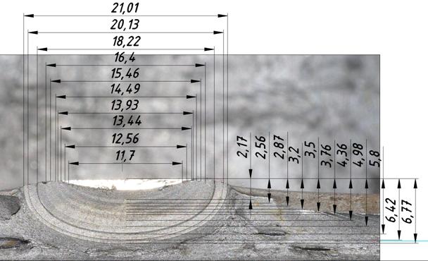 Для получения представительной выборки значений микротвердости на диагностируемой поверхности конструкции делается 60 - 70 замеров с фиксированным шагом. Для трубных сталей шаг выбран в диапазоне 0,02-0,03 мм, усилия на индентор 10 – 25 грамм. Перед проведением замеров с поверхности удаляется слой металла толщиной не менее 0,5 мм с последующей ручной шлифовкой.
