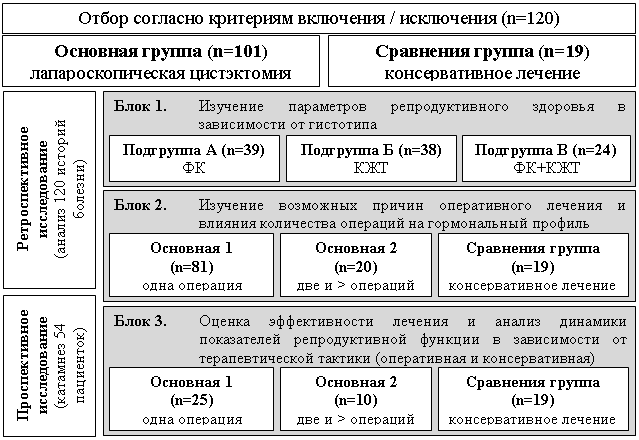 На первом этапе работы проведено ретроспективное исследование. Материалом послужили истории болезни 120 женщин репродуктивного возраста с ФнК. Основную группу (n=101) составили пациентки с осложнённым и/или рецидивирующим течением ФнК, которым произведена лапароскопическая цистэктомия. В основной группе сформированы подгруппы: основная 1 (n=81) – операция на яичнике проведена впервые и основная 2 (n=20) – количество операций две и более. Группу сравнения (n=19) составили женщины с ФнК, не имеющие операций на яичниках в анамнезе, которым не потребовалось хирургического лечения кист.