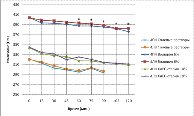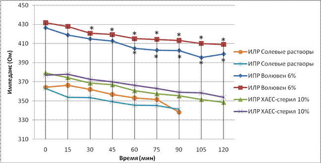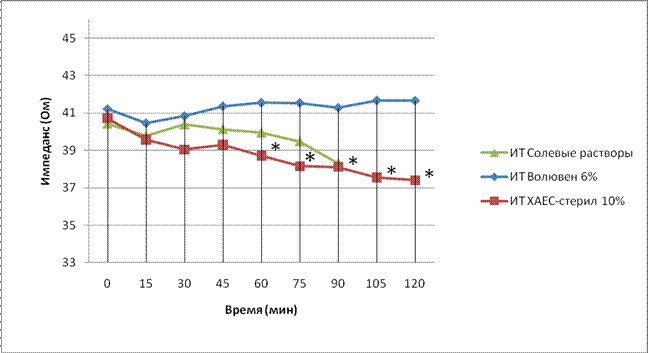 В третьей группе, где использовался ГЭК «ХАЕС-стерил 10%», было выявлено снижение импеданса туловища на всём протяжении исследования до 8,2% (9-й этап) по сравнению с исходом. С 60-й минуты течения анестезии снижение импеданса туловища было статистически достоверно (p<0,05).