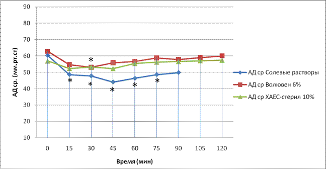 Динамика АДср. на этапах исследования в зависимости от характера инфузионной терапии. (М+δ, n=10) (Рис.7)