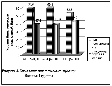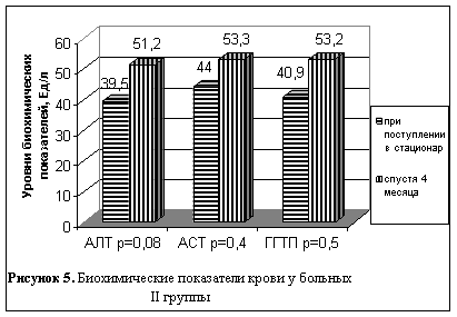 На фоне лечения реафероном отмечали снижение маркеров цитолиза и холестаза (рисунок 4), чего не наблюдали в группе сравнения (рисунок 5).